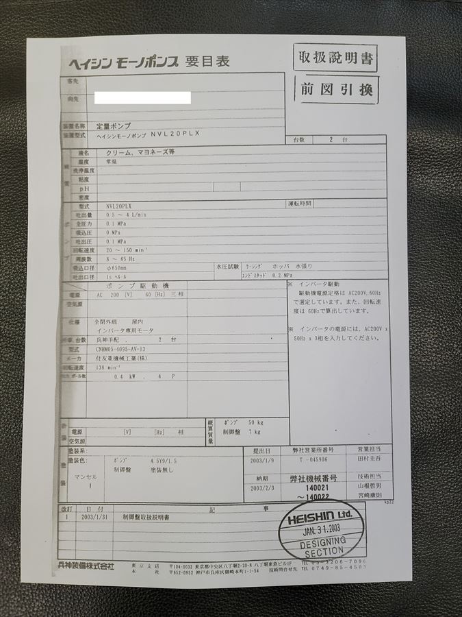 中古機械情報, 充填機・ポンプ類, 食品関連機器 兵神装備(株) 兵神モーノポンプ③ NVL20PLX /2003年製 お問合せ番号 Y-4797 品 名 兵神モーノポンプ ③ 型 式 NVL20PLX 種 類 食品関連機器 ポンプ類 程 度 メーカー名 兵神装備 株式会社 年 式 2003年製 素 材 外 寸 付属機器 電 源 三相200V 60Hz 金 額 お問合せ下さい 運 賃 お問合せ下さい 保証期間 1ヶ月 備 考 吐出量:0.5~4L/min HOME | 中古機械情報 | 売約済み物件 | お問合せ 2021/12/07 お買上げ有難うございました。 アネスト岩田(株) オイルフリーコンプレッサー/2014年製 コンプレッサー 2台・エアードライヤー/2009年製