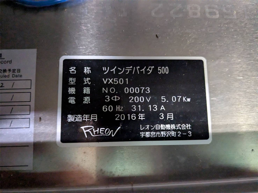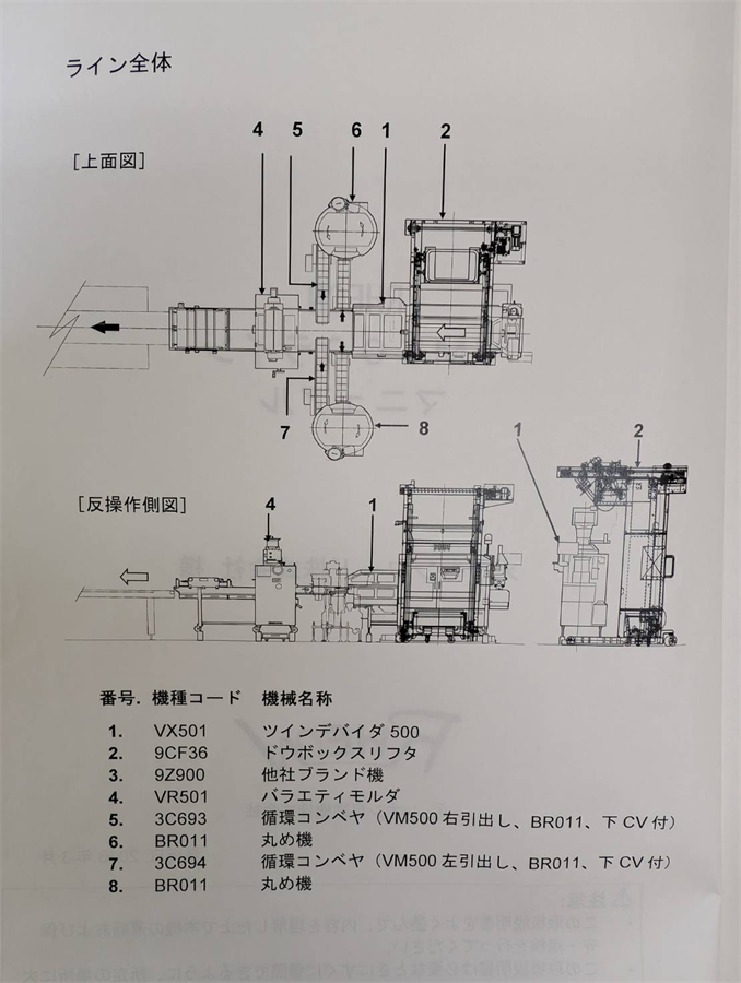 ・ホッパー容量:75L ・最大計量カット数:42回/分 ・ツインデバイダ500:W2400×D900×H2000 ・バラエティモルダ:W2600×D1400×H1600 ・ボックスリフト :W1250×D800×H1300 ×2台 ・丸め機 :W900×D1000×H1250 ×2台 (分割重量範囲:100~300g) |
