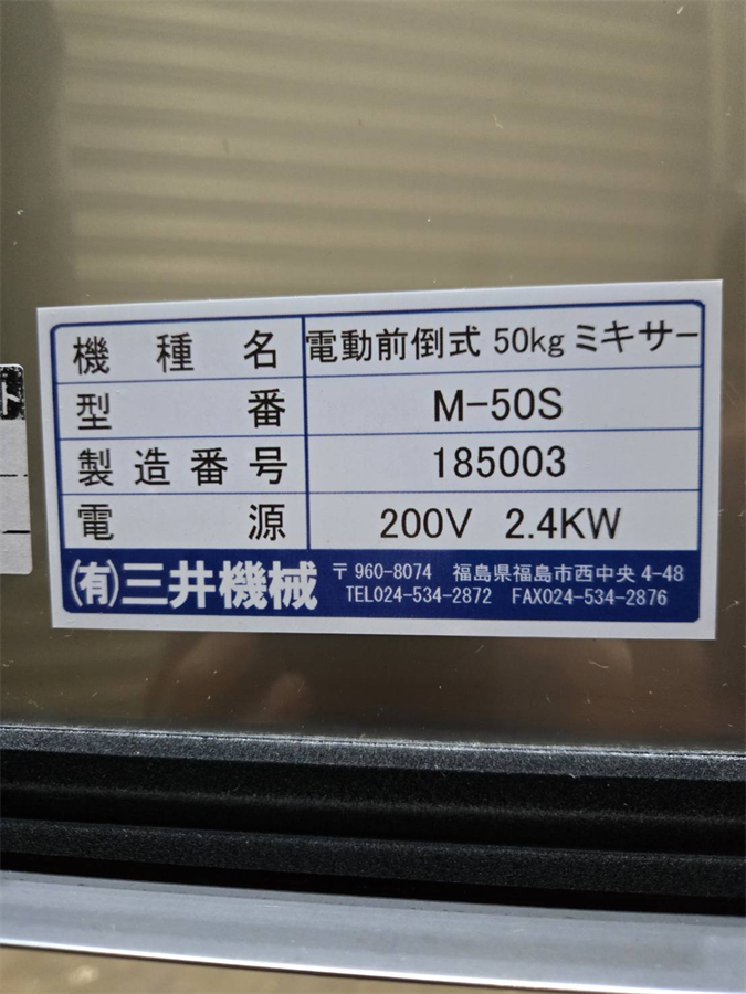 Topics, 売約済み物件 2025/09/01 お買い上げ有難うございました。(有)三井機械 電動前倒式50㎏ミキサー M-50S/2021年製 お問合せ番号 Y-5665 品 名 電動前倒式50㎏ミキサー 型 式 M-50S 種 類 食品加工機器 食品加工機器関連 程 度 メーカー名 有限会社 三井機械 年 式 2021年製 外 寸 W1450×D750×H1100 付属機器 電 源 三相200V 金 額 売約済み 運 賃 保証期間 1ヶ月 保管場所 加西倉庫 備 考 容量:50㎏ HOME | 中古機械情報 | 売約済み物件 | お問合せ ディオズナ社製 スパイラルミキサー② SP-120D/2018年製 吉泉産業(株) 葉野菜角切り高速スライサー YS-7100X/2013年製