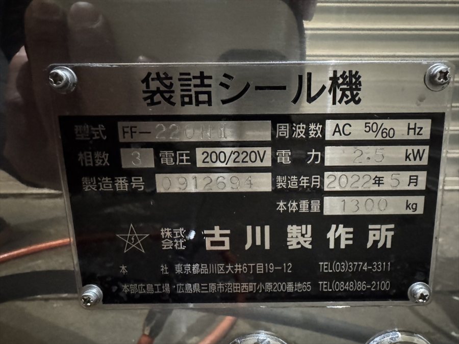 Topics, 売約済み物件 2025/06/16 お買い上げ有難うございました。(株)古川製作所 袋詰シール機 FF-220NⅢ/2022年製 お問合せ番号 Y-6108 品 名 袋詰シール機 型 式 FF-220NⅢ 種 類 包装・梱包機器 包装機器関連 程 度 メーカー名 株式会社 古川製作所 年 式 2022年製 素 材 外 寸 付属機器 電 源 三相200V 50/60Hz 金 額 売約済み 運 賃 保証期間 1ヶ月 備 考 ・重量:1300 ㎏ ・能力:10~50 袋/分 ・使用可能袋:W80~240 × L100~350 (㎜) HOME | 中古機械情報 | 売約済み物件 | お問合せ オリヒロ(株) 汎用液体製充填包装機 ONP-2020ASⅡ/2010年製 (株)興和工業所 円型振動振るい機 KGO-800-1DBC/2010年製