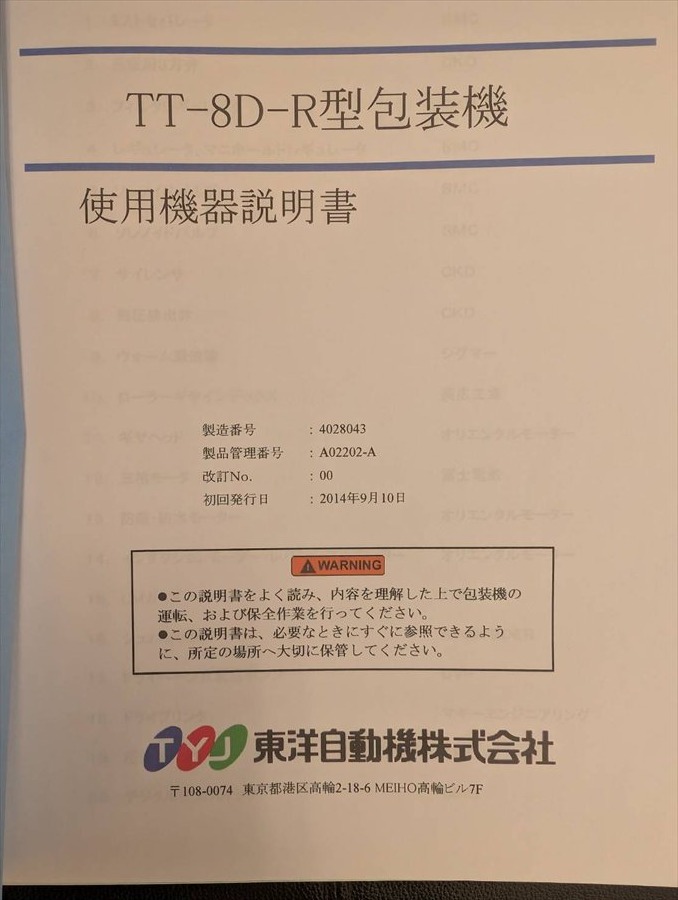 Topics, 売約済み物件 2025/07/03 お買い上げ有難うございました。東洋自動機(株) 自動充填包装機 TT-8D-R/2014年製 お問合せ番号 Y-6106 品 名 自動充填包装機 型 式 TT-8D-R 種 類 包装・梱包機器 包装機器関連 程 度 メーカー名 東洋自動機 株式会社 年 式 2014年製 外 寸 W3102 × L1800 × H2055(㎜) 付属機器 電 源 三相200V 50/60 Hz 金 額 売約済み 運 賃 保証期間 1ヶ月 保管場所 備 考 ・重量:2600 ㎏ HOME | 中古機械情報 | 売約済み物件 | お問合せ (株)フジキカイ 横ピロー包装機 FW3400/2012年製 BUSCH 真空ポンプ RA0302 D 5Z3、真空ブースター WV 1000C/2014年製