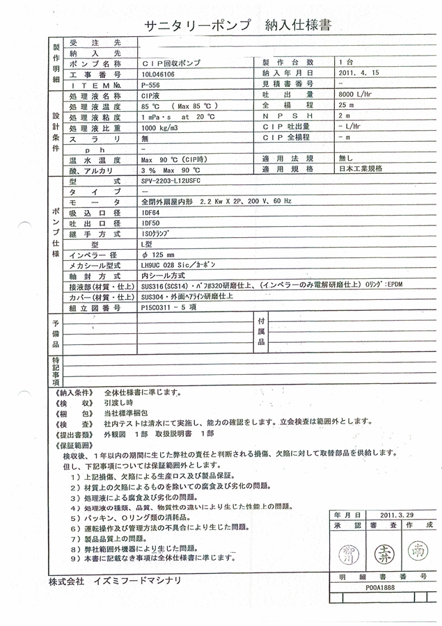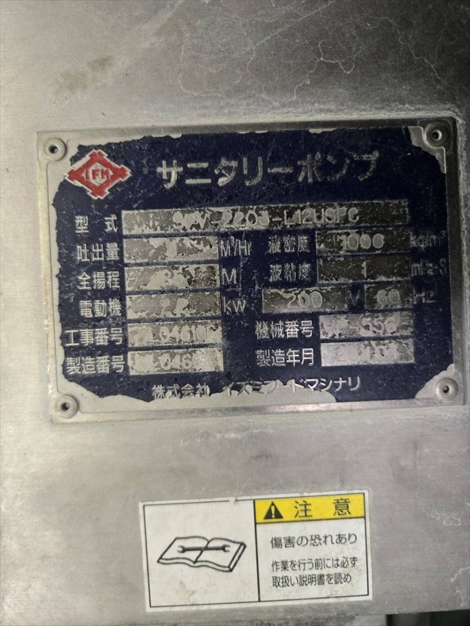 中古機械情報, 充填機・ポンプ類, 食品関連機器 (株)イズミフードマシナリ サニタリーポンプ SPV-2203-L12USPC/2011年製 お問合せ番号 Y-6209 品 名 サニタリーポンプ 型 式 SPV-2203-L12USPC 種 類 食品関連機器 充填・ポンプ類 程 度 メーカー名 株式会社 イズミフードマシナリ 年 式 2011年製 外 寸 付属機器 電 源 200V 60 Hz 金 額 お問合せ下さい 運 賃 お問合せ下さい 保証期間 1ヶ月 保管場所 伊丹倉庫 備 考 HOME | 中古機械情報 | 売約済み物件 | お問合せ (株)イズミフードマシナリ サニタリーポンプ SPV-2203-L13USF0/2011年製 アルファラバル (株) ロータリーポンプ① OPTILOBE 22/2011年製