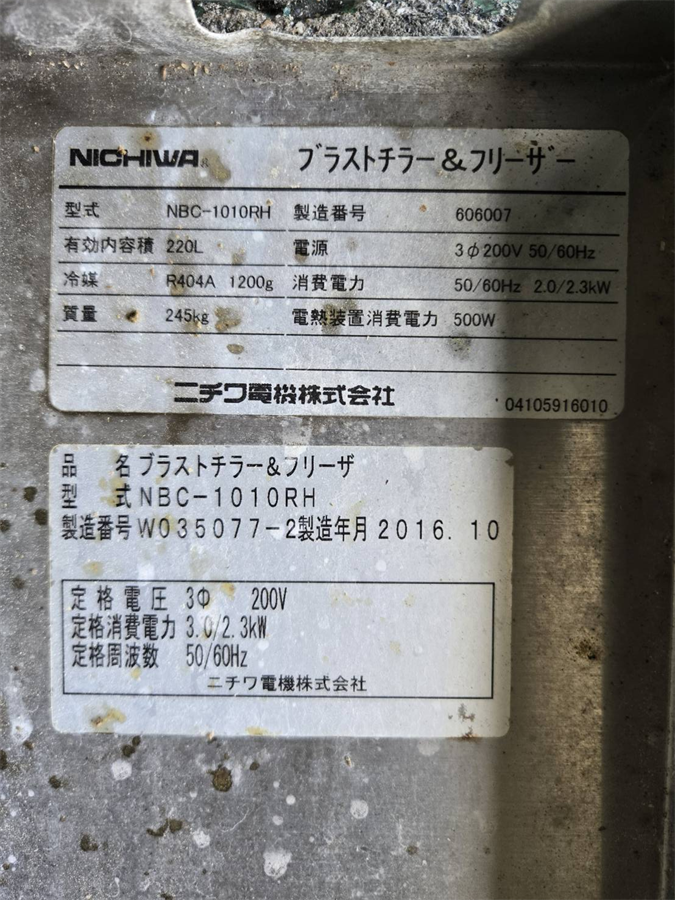 中古機械情報, 厨房機器, 厨房機器関連 ニチワ電機(株) ブラストチラー&フリーザー NBC-1010RH/2016年製 お問合せ番号 Y-6322 品 名 ブラストチラー&フリーザー 型 式 NBC-1010RH 種 類 厨房機器 厨房機器関連 程 度 メーカー名 ニチワ電機 株式会社 年 式 2016年製 外 寸 W818×D915×H1902(㎜) 付属機器 電 源 3相200V 50/60 Hz 金 額 お問合せ下さい 運 賃 お問合せ下さい 保証期間 1ヶ月 保管場所 伊丹倉庫 備 考 ・質量 :245(㎏) ・内容積:220(L) HOME | 中古機械情報 | 売約済み物件 | お問合せ (株)マルゼン スチームコンベクションオーブン SSCX-20/2018年製 ニチワ電機(株) ブラストチラー&フリーザー NBC-1010RH/2017年製