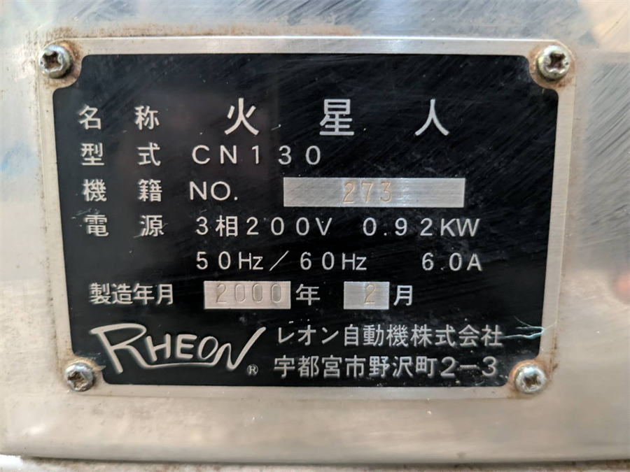 Topics, 売約済み物件 レオン自動機(株) 包餡機「火星人」 CN130/2000年製 お問合せ番号 Y-6288 品 名 包餡機「火星人」 型 式 CN130 種 類 製菓機器 その他の関連機器 程 度 メーカー名 レオン自動機 株式会社 年 式 2000年製 外 寸 付属機器 電 源 3相200V 50/60 Hz 金 額 売約済み 運 賃 保証期間 1ヶ月 保管場所 備 考 HOME | 中古機械情報 | 売約済み物件 | お問合せ アネスト岩田(株) 窒素発生装置 NP-22CF-4N/2018年製 レオン自動機(株) 包餡機「火星人」 CN500/2004年製