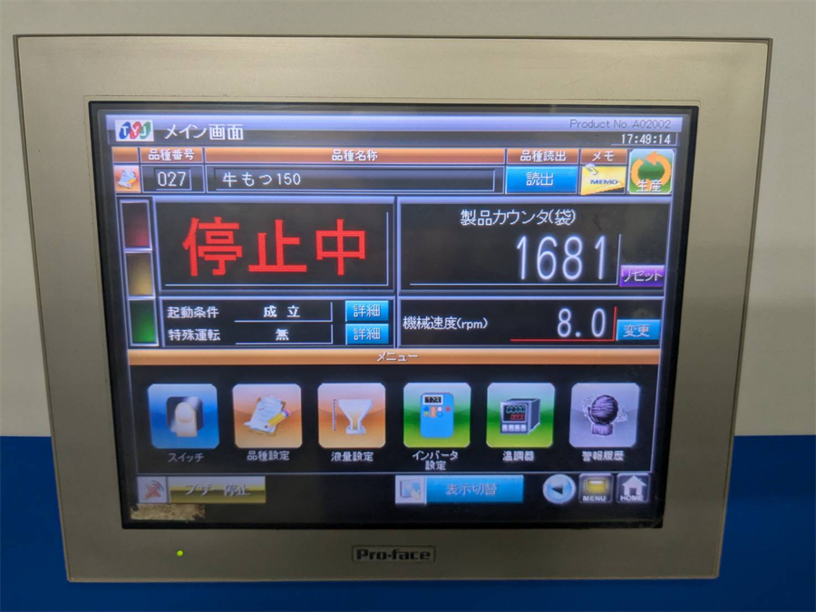 Topics, 売約済み物件 2025/11/14 お買い上げ有難うございました。東洋自動機(株) 給袋式自動充填包装機 TT-8CR/2014年製 お問合せ番号 Y-6291 品 名 給袋式自動充填包装機 型 式 TT-8CR 種 類 包装・梱包機器 包装機器関連 程 度 メーカー名 東洋自動機 株式会社 年 式 2014年製 外 寸 W1954×D2675×H1680(㎜) 付属機器 電 源 3相200V 50/60 Hz 金 額 売約済み 運 賃 保証期間 1ヶ月 保管場所 加西倉庫 備 考 ・重量:1600(㎏) ・包装能力:15~30袋/分 ※ウェット製品向け HOME | 中古機械情報 | 売約済み物件 | お問合せ 三光機械(株) 自動充填包装機 SAM-FP300/2007年製 (株)イシダ コンピュータースケール CCW-R2-107PS-S/02-SS-X/2023年製
