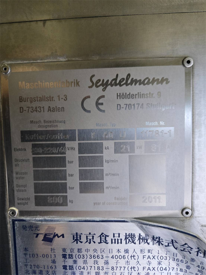Topics, 売約済み物件 Sydelmann社 サイレントカッター K60U/2011年製 お問合せ番号 Y-6363 品 名 サイレントカッター 型 式 K60U 種 類 食肉・水産加工機器 食肉加工機器 程 度 メーカー名 Sydelmann社(ザイデルマン社) 年 式 2011年製 外 寸 付属機器 電 源 200ー220V 金 額 売約済み 運 賃 保証期間 1ヶ月 保管場所 加西倉庫 備 考 ・重量:800(㎏) ・容量:60(L) HOME | 中古機械情報 | 売約済み物件 | お問合せ VEMAG社 真空充填機 Robby/2011年製 2025/11/06 お買い上げ有難うございました。(株)サムソン レトルト殺菌装置「Cook Boy」CB-40/2017年製