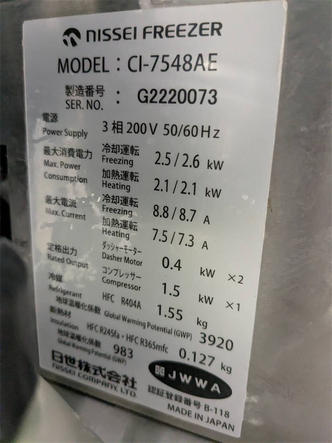 その他の関連機器, 中古機械情報, 製菓機器 日世(株) ソフトクリームフリーザー② CI-7548AE/2022年製 お問合せ番号 Y-6371 品 名 ソフトクリームフリーザー(SN:G2220073) 型 式 CI-7548AE 種 類 程 度 メーカー名 日世 株式会社 年 式 2022年製 外 寸 W470×D850×H860(㎜) 付属機器 画像⑧参照 電 源 3相200V 50/60 Hz 金 額 お問合せ下さい 運 賃 お問合せ下さい 保証期間 1ヶ月 保管場所 伊丹倉庫 備 考 ・重量:180(㎏) HOME | 中古機械情報 | 売約済み物件 | お問合せ 2025/10/06 お買い上げ有難うございました。(株)bet ラボ用ビール製造試験装置一式/2014年製 (株)カントー ハンドリフト① B-OP