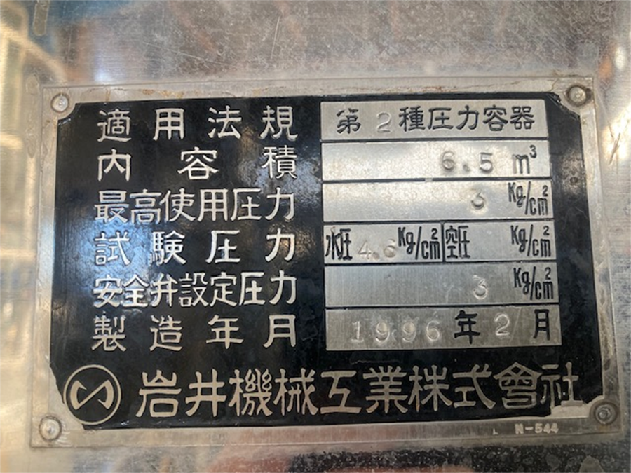 中古機械情報, 特選機器・商品情報 岩井機械工業(株) 3000L ステンレスタンク/1996年製 お問合せ番号 特選機器・商品情報 品 名 3000L ステンレスタンク 型 式 種 類 程 度 メーカー名 岩井機械工業 株式会社 年 式 1996年製 外 寸 付属機器 電 源 金 額 お問合せ下さい 運 賃 お問合せ下さい 保証期間 1ヶ月 保管場所 備 考 ・内容積:6.5(㎥) ※第2種圧力容器 HOME | 中古機械情報 | 売約済み物件 | お問合せ 三共空調(株) エアシャワー AS-22A/2023年製 岩井機械工業(株) 5000Lジャケットタンク①/1998年製