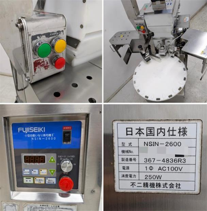 中古機械情報, 特選機器・商品情報 不二精機(株) 小型自動いなり寿司機Ⅱ NSIN-2600/2017年製 お問合せ番号 特選機器・商品情報 品 名 小型自動いなり寿司機Ⅱ 型 式 NSIN-2600 種 類 程 度 メーカー名 不二精機 株式会社 年 式 2017年製 外 寸 W550×D850×H1300(㎜) 付属機器 電 源 単相100V 50/60 Hz 金 額 お問合せ下さい 運 賃 お問合せ下さい 保証期間 1ヶ月 保管場所 備 考 ・重量:300(㎏) ・生産能力:2600個/h ・ホッパー容量:3升(約9㎏) HOME | 中古機械情報 | 売約済み物件 | お問合せ 2026/01/16 お買い上げ有難うございました。(株)イシダ コンピュータースケール CCW-R2-107PS-S/02-SS-X/2023年製 サンデン・リテールシステム(株) 冷凍自動販売機 FIV-JIA2110N/2021年製
