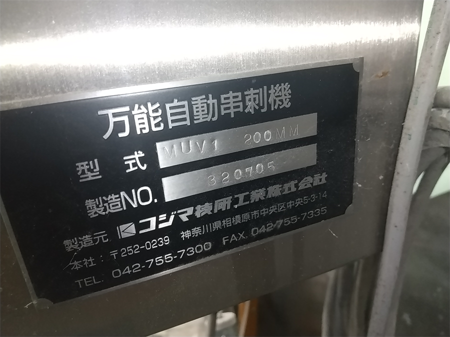 中古機械情報, 特選機器・商品情報 コジマ技研工業(株) 万能自動串刺機 MUV1/2017年製 お問合せ番号 特選機器・商品情報 品 名 万能自動串刺機 型 式 MUV1 種 類 程 度 メーカー名 コジマ技研工業 株式会社 年 式 2017年製 外 寸 W1804×D946×H1645(㎜) 付属機器 電 源 100V 50/60 Hz 金 額 お問合せ下さい 運 賃 お問合せ下さい 保証期間 1ヶ月 保管場所 備 考 ・最大生産能力:1200本(50Hz)、1500本(60Hz) ・串長:200(㎜) ※1本刺タイプ HOME | 中古機械情報 | 売約済み物件 | お問合せ エーエフエム(株) 原料供給傾斜コンベヤ TCV-3021/2023年製 (株)イシダ 組み合わせ計量機 CCW-RV-214W-1S/30-SS/2015年製